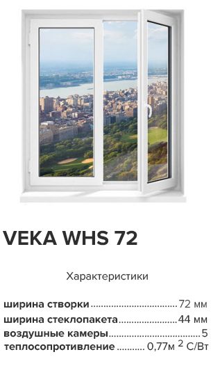 Возможна комплектация стеклопакетом различных характеристик до 44 мм. Профиль VEKA WHS 72 шириной 72 мм. Система профиля из 5-ти воздушных камер выполнена так, чтобы был обеспечен водоотвод, а также закреплено армирование и надёжно установлена фурнитура. Если сравнивать систему с аналогами других производителей, например REHAU, то в этой системе, за счёт увеличенной монтажной ширины и увеличенного фальца, имеется возможность установки более широкого стеклопакета, что позволяет повысить шумоизоляцию и теплоизоляцию.